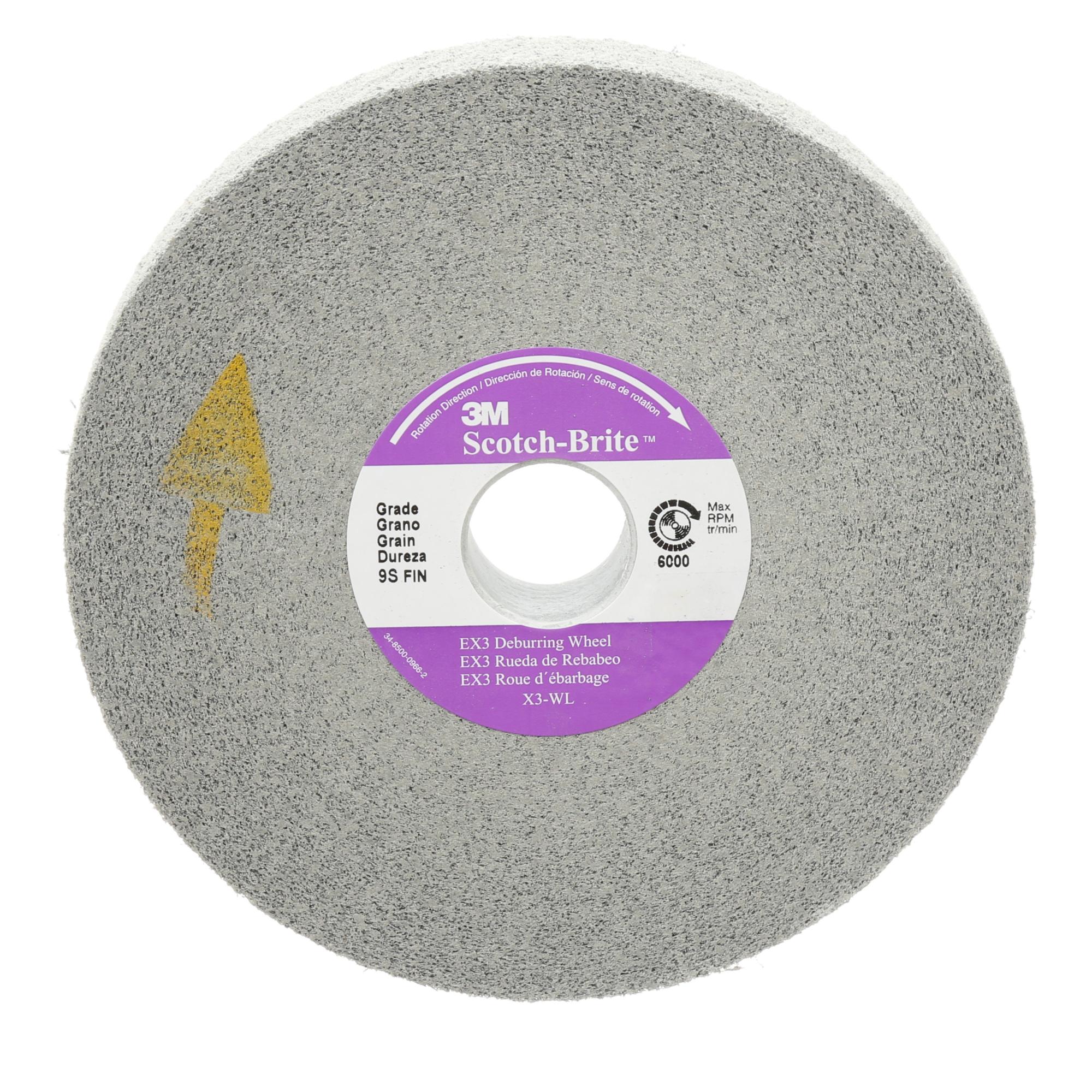 Scotch-Brite EX3 Deburring Wheel is a convolute-constructed, hard, durable deburring wheel suited for applications where edge retention is a must. The wheel performs best when consistently presented with a sharp edge or metal burrs. A unique resin system resists smearing and heat buildup.Scotch-Brite™ EX3 is an effective wheel to deburr, blend, finish and polish edges on glass, hard and soft composites, and metals such as builder's hardware, medical instruments, metal fabrication, metal implants, plumbing fixtures, and turbine engines. Because of its hard density, we do not recommend the EX3 for applications where conformability and finishing of flat surfaces are required.