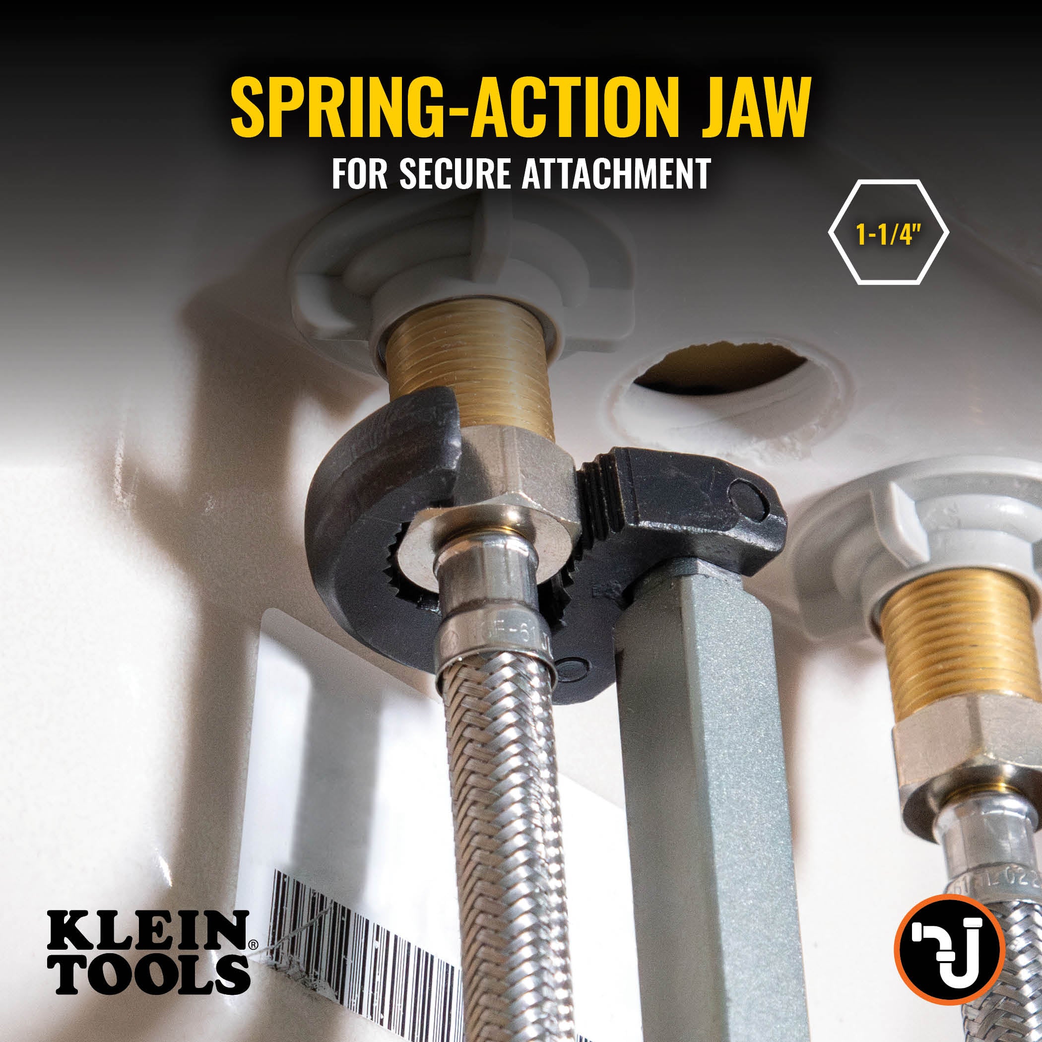 The Klein Tools Telescoping Basin Wrench is designed to work in hard-to-reach places, extending from 10 to 17 inches. The optimized spring-action jaw design allows for secure attachment around hex nuts up to 1-1/4-Inch (3 cm). For added leverage, the base of the handle accommodates 3/8-Inch socket wrenches and most standard-sized screwdrivers.