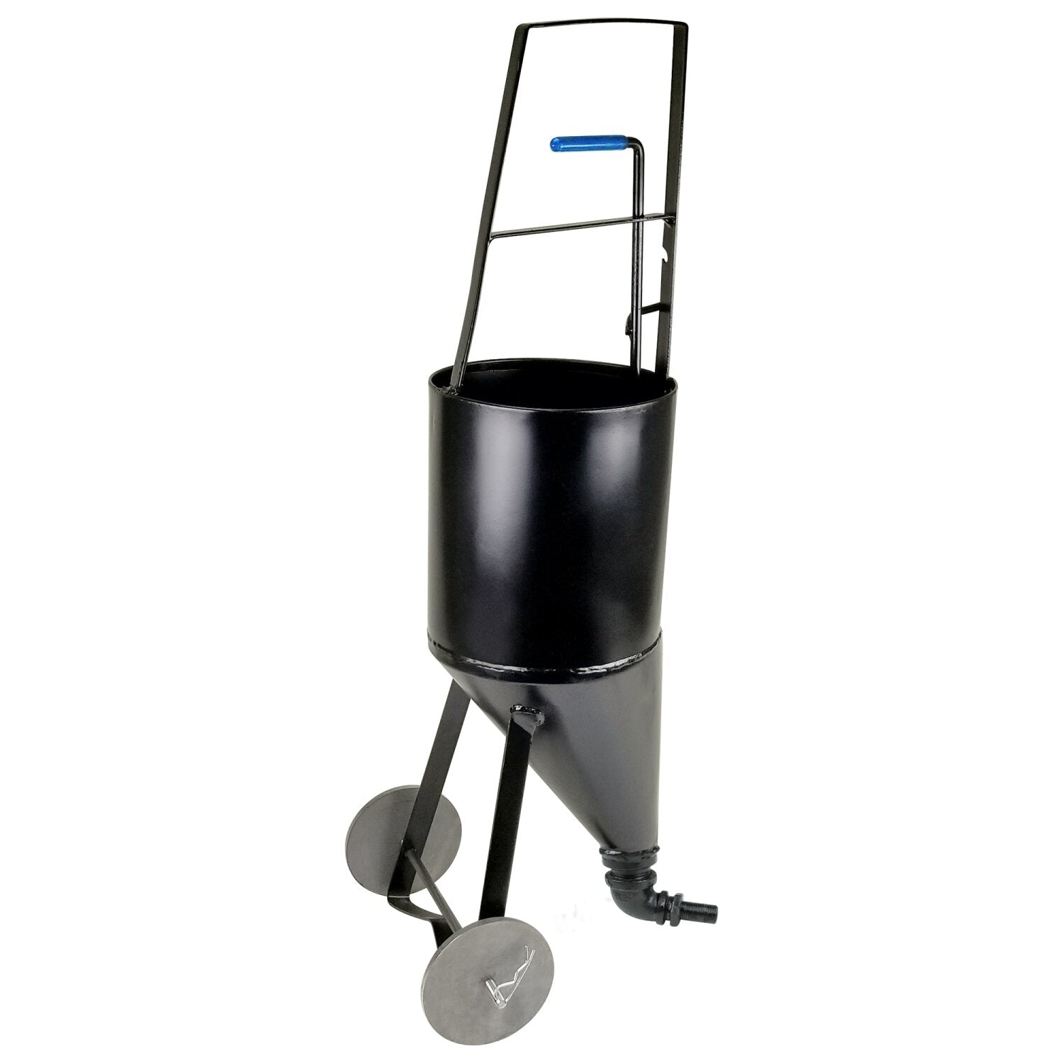 This 2.5 gallon, heavy gauge steel pour pot is an easy way to fill asphalt cracks with hot or cold crack filler. The pour pot is constructed with strong welds to stand up to the rigors of the job site. The convenient stand up design minimizes stooping while patching asphalt. The 3-size pouring nozzle allows the user to apply the perfect amount of filler for the job. The easy-to-use control valve top has fingertip control. A convenient squeeze opens and releases the material onto the pavement. The valve locks open for a continuous flow when needed. A plastic grip makes for a comfortable grip. Two replaceable wheels attach to the base for ease in mobility around the job site.
