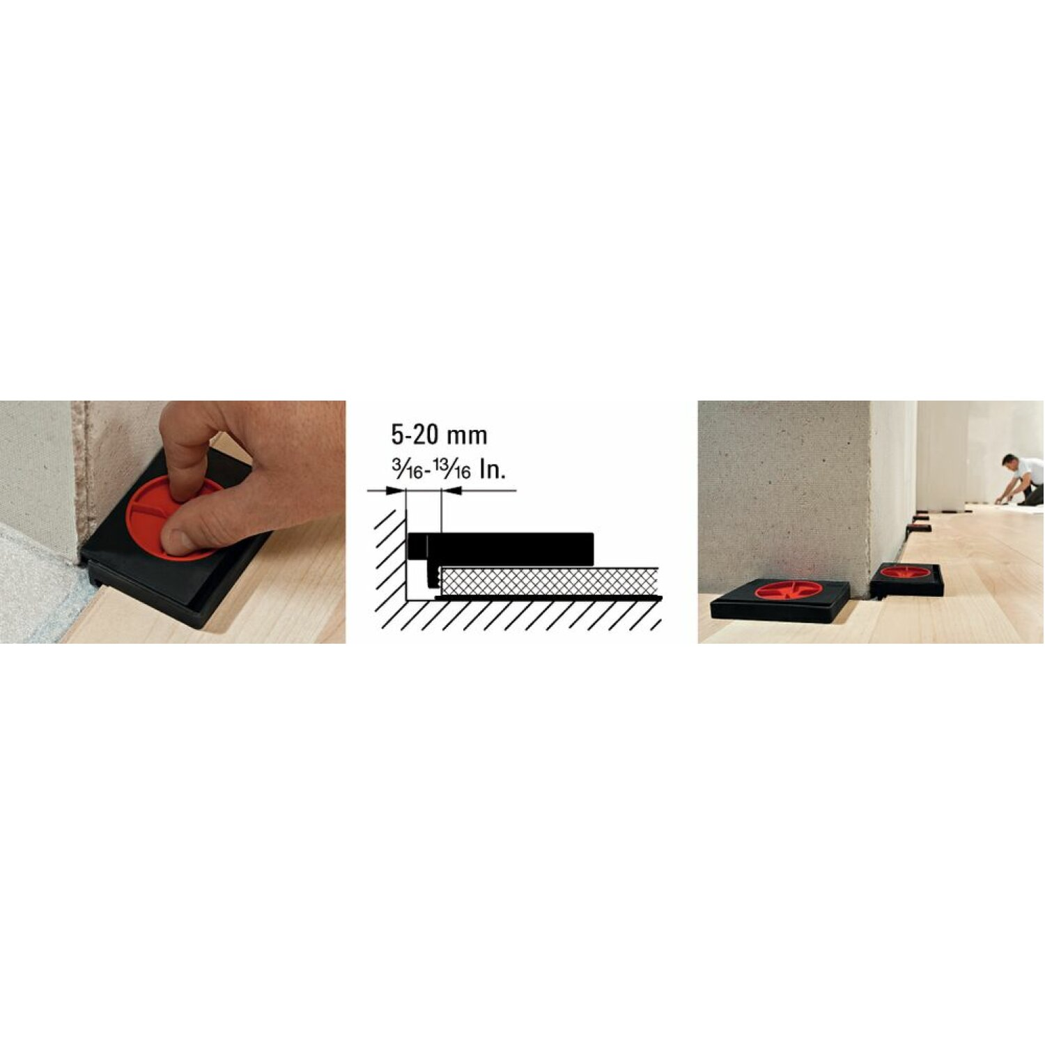 Simply insert between the wall and the first row of flooring. Adjustable to compensate for wall irregularities and removal is a quick turn of the dial to release pressure.
