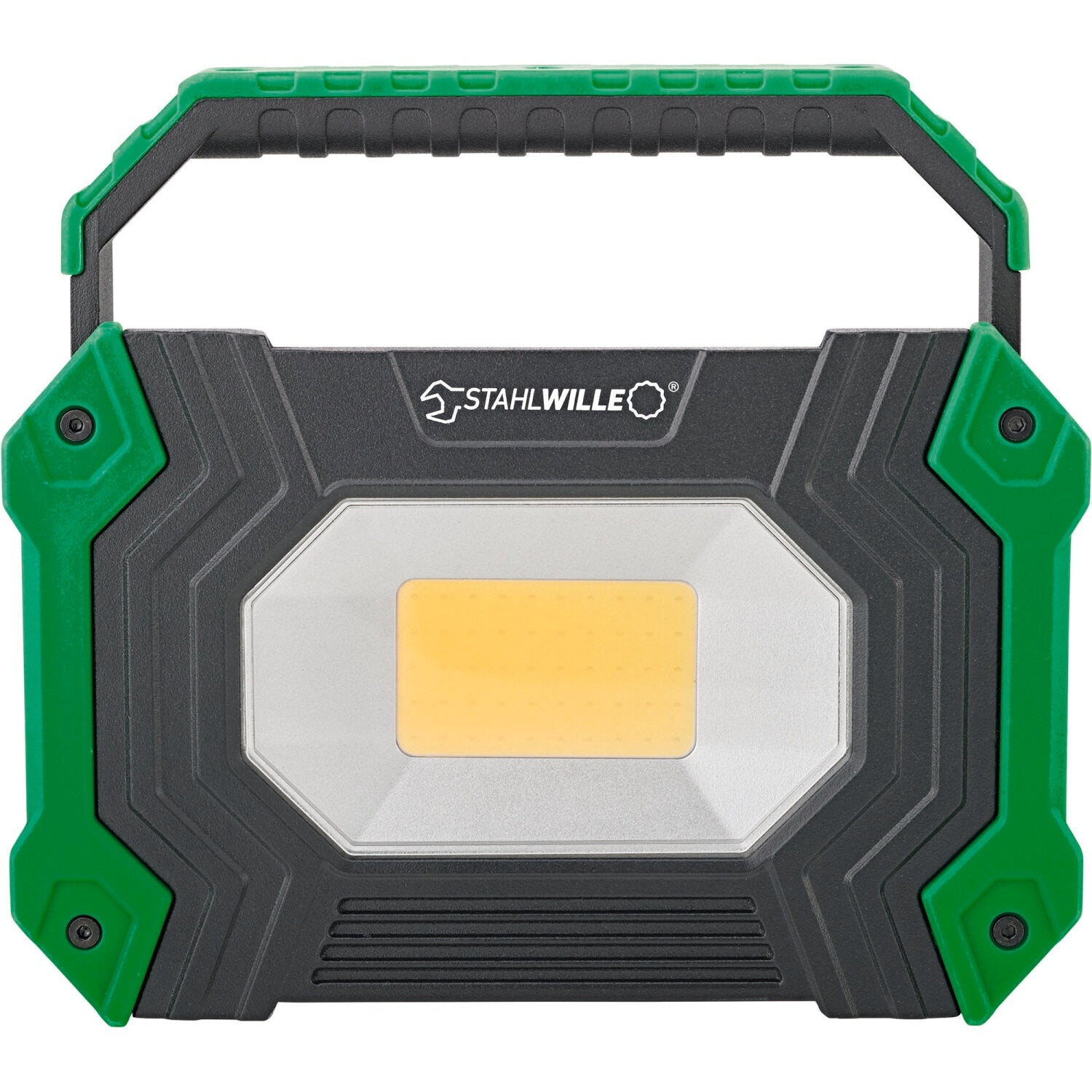 - Cordless 30 watt LED spotlight with magnetic holder for indoor and outdoor work.