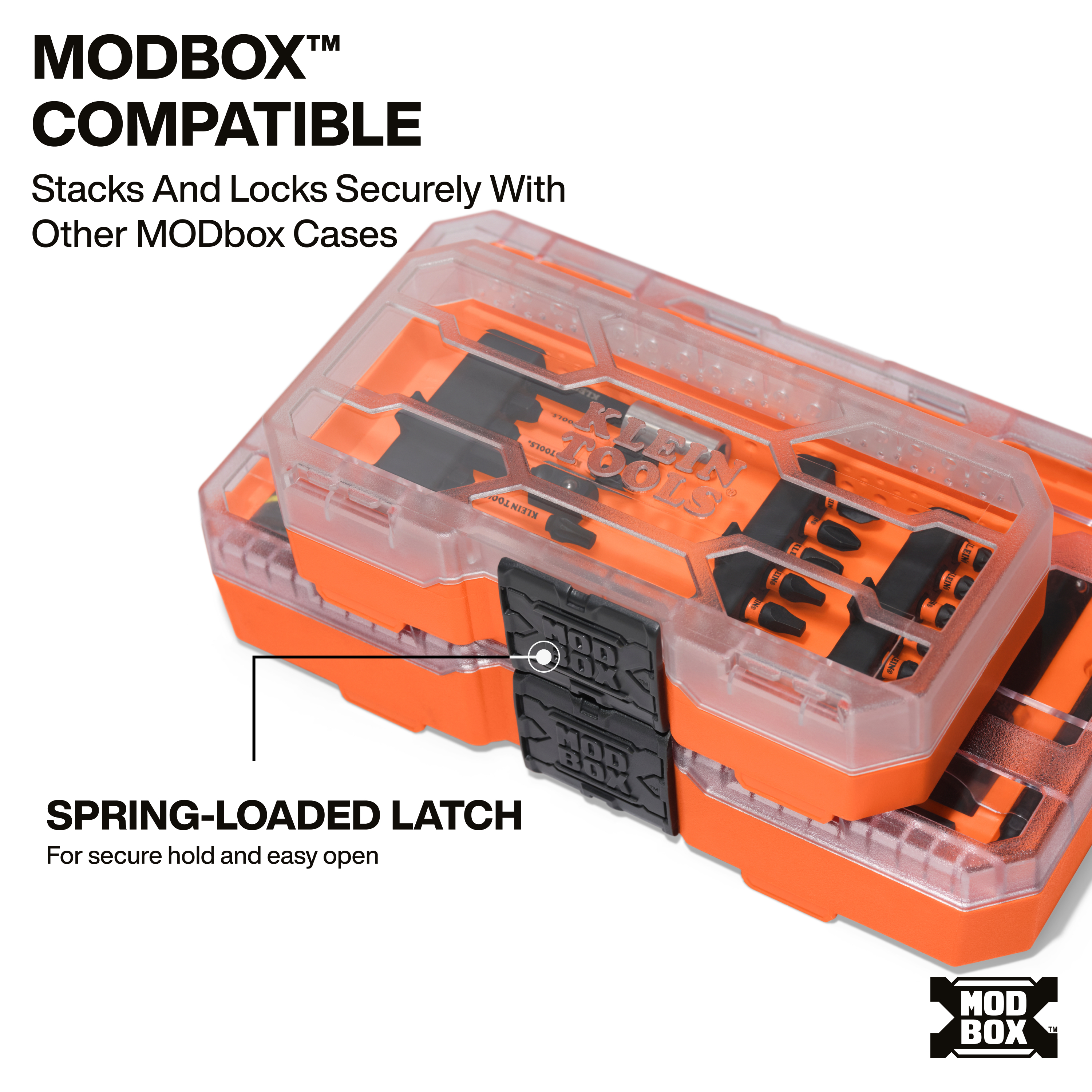 - MODbox™ compatible storage case stacks and locks securely with other Klein Tools case sets for organized transport