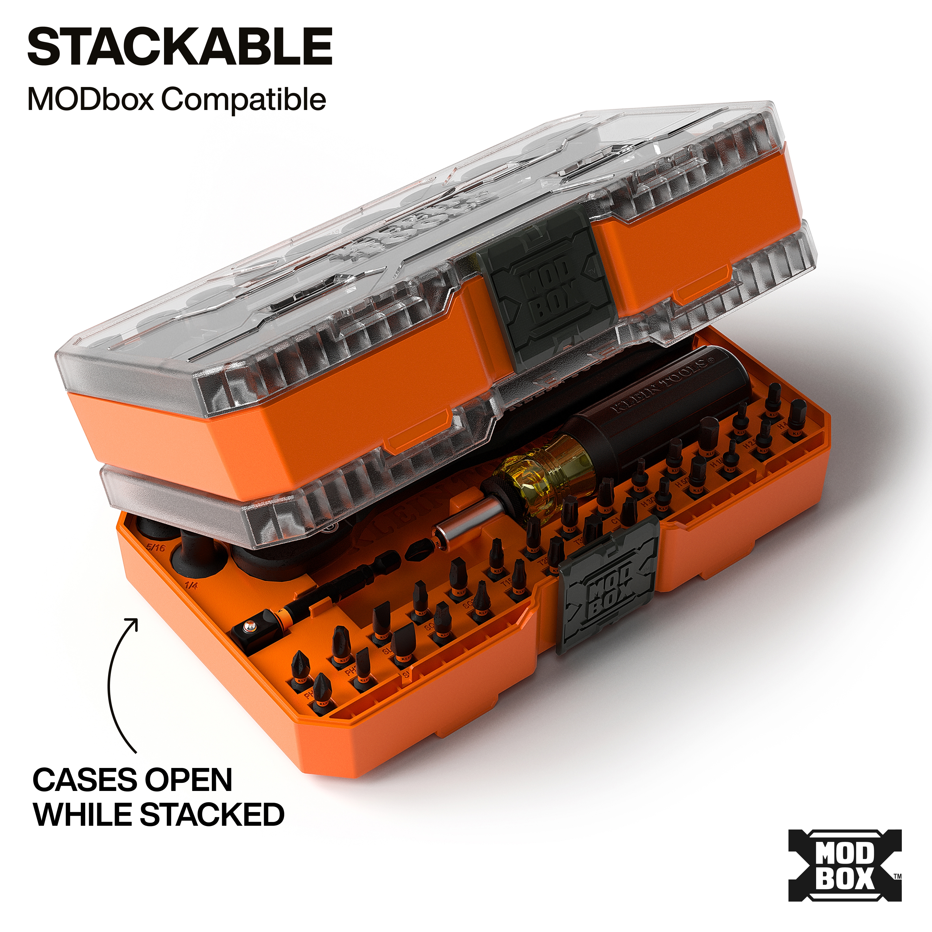Klein Tools designed a premium Bit Set for the professional tradesman and DIY enthusiasts. This screwdriver includes a magnet for secure bit retention and the socket wrench ensures maximum torque. The bits are made of high-impact rated S2 steel with an optimized torsion zone to enhance durability by absorbing impact forces. All pieces fit in an impact-resistant case featuring steel hinges and a stay-shut latch with modular stack-ability with cases of similar design and is MODbox compatible.