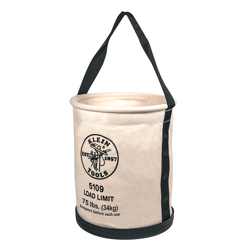 The Klein Tools 5109 6 Canvas Wide-Opening Straight-Wall Bucket has a 75 lb. Max Load Rating. Polypropylene-rope handle reinforced with leather for water resistance and strength. Durable, straight-wall and tapered-wall buckets are made of heavy-duty canvas. High-density polyethylene top ring for strength and chemical resistance. No. 6 canvas. The No. canvas refers to the canvas weight. No. 1 being the thickest and No. 8 being the thinnest. Black molded polypropylene bottom.