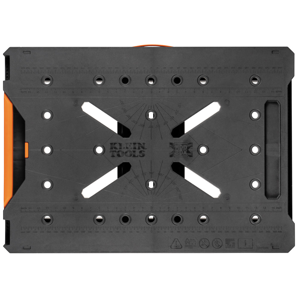 The MODbox Folding Work Bench is a versatile, compact, portable workstation. The large work surface includes holes to secure materials in place with clamps. MODbox accessories easily attach to rails on both ends, allowing for convenient storage of parts and tools. Designed to quickly open and close with the push of a button and push/pull of the handle, the work bench easily maneuvers around a job site or garage and easily folds for compact storage.