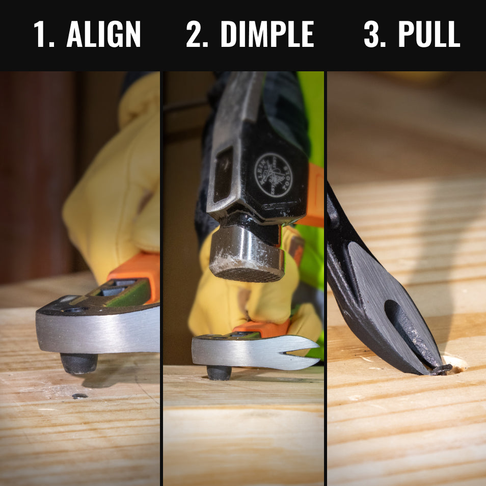 The Klein Tools 8-Inch Nail Puller removes nails with minimal damage. Designed with comfort in mind, the TPR grip absorbs shock during heavy-duty tasks. For embedded nails, use the nail dimpler for swift and easy removal.