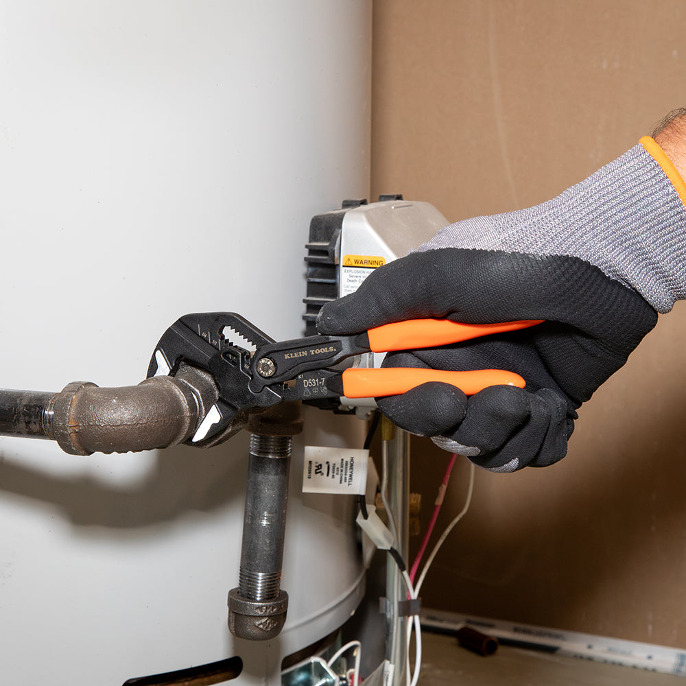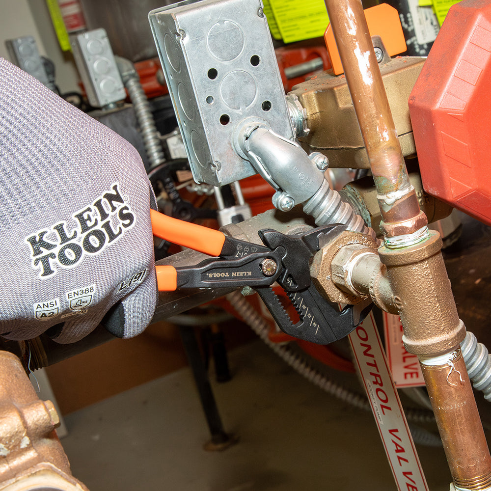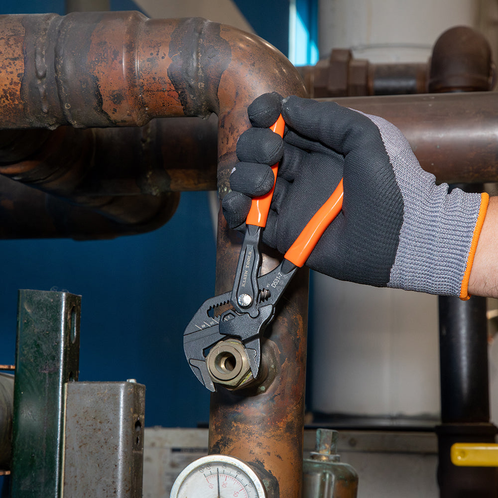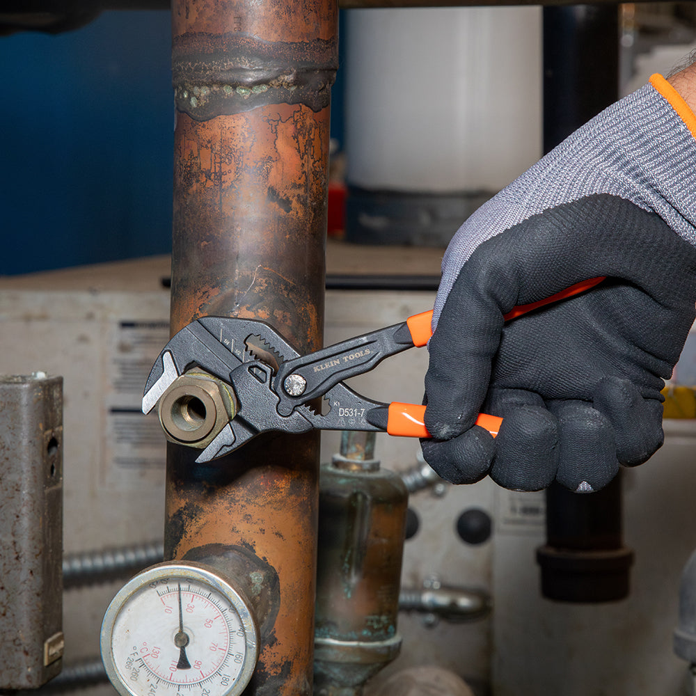 Klein's 7-Inch Compact Plier Wrench is a versatile adjustable wrench featuring parallel jaws for a secure, smooth grip on nuts, bolts, and workpieces, ensuring damage-free operation. The handle lever adjustment reduces hand travel for easy use in confined spaces, while the high leverage ratio provides exceptional grip for holding or bending workpieces. The laser-etched size markings make it quick and easy to find the correct jaw opening, saving you time on every job.