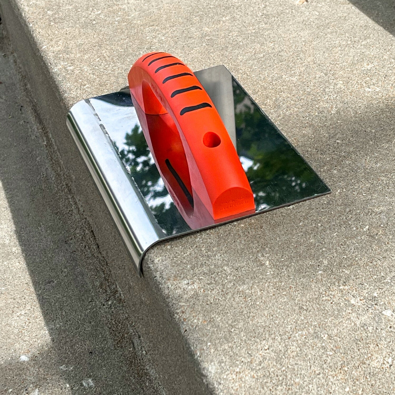The large 10" long stainless steel blade moves smoothly along edges of cement sidewalks and slabs. This edger creates a 1/2" radius with lip on the edge of concrete slabs to prevent that edge from chipping with wear. The lip extends down for even coverage along ends and forms. The 6" wide tool provides the perfect amount of coverage on concrete highways, sidewalks, and other large projects. The strong #16 gauge stainless steel blade is long lasting and easy to clean-up. Designed to fit the exact contour of the edge for a professional finish. The heavy gauge blade is rivet-free for a flawless finish. Uniquely designed with a float handle for greater control on a large edger. The ProForm® soft grip handle is precisely positioned for perfect balance with less fatigue. Kraft Tool's patented ProForm® soft grip handle (US Patent #6,473,939 B1 and US Patent #6,821,468 B2) provides a comfortable grip. The enhanced texture ribbing of the handle reduces fatigue and provides a great grip even when wet. The bright orange handle is easy to spot on a jobsite even after use.