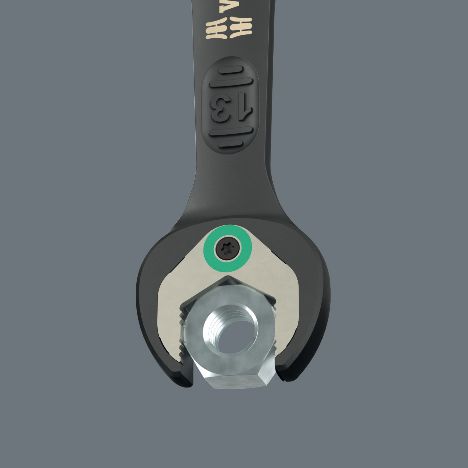 11-piece ring ratchet spanner set by Wera. For hexagon screw heads and bolts. With holding function enabled by a metal plate in the mouth, which reduces the risk of losing screws and sockets. With its extra hard teeth, the exchangeable metal plate in the mouth secures screws and sockets and reduces the risk of slipping. The integrated end stop can prevent the screw head from slipping down and allows application of high torques. The double hexagon geometry ensures a positive connection with the screw or bolt and thus reduces the risk of slipping. A return angle of only 30° at the jaw end avoids time-consuming rotating of the tool whilst screwdriving. With its exceptionally high fine toothing of 80 teeth, the ratchet mechanism at the ring side offers flexibility even in confined spaces. The specially engineered geometry allows high torque transmission and high bending stiffness. Made of high-performance chromium molybdenum steel with a high-quality, robust matt-black chrome-plated surface. With Take it easy tool finder: colour coding by size. In a robust roll pouch.