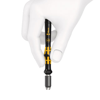 ESD-safe Wera Micro screwdriver set. Dependable protection against electrostatic energy and associated damage. Rapid twisting results from fixing the hand on the head and using the fast-turning zone just below. This makes time-consuming grip adjustments unnecessary. Power zones with integrated soft sections ensure the transfer of high loosening and tightening torque; a precision zone for the right rotation angle during fine adjustment work. The Black Point tip offers optimised corrosion protection and an exact fit.