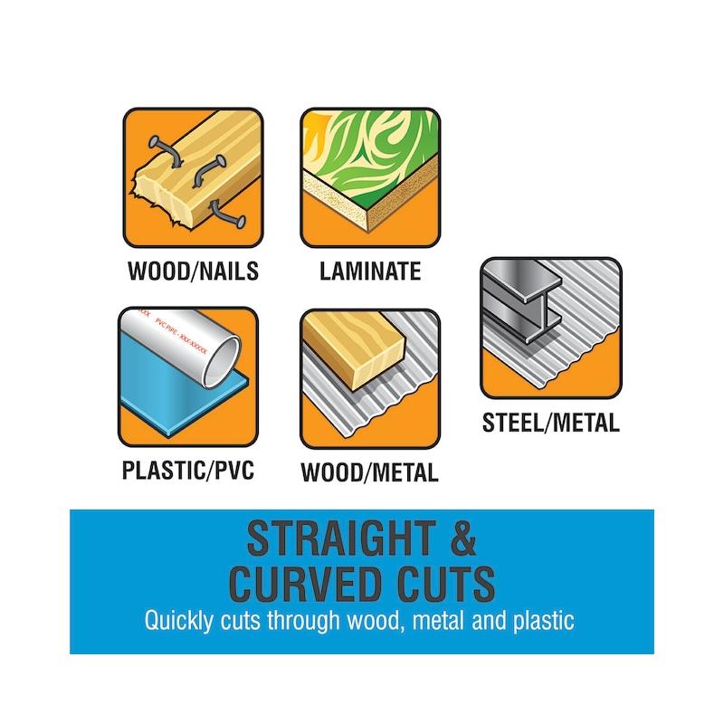 • Cobalt bi-metal blades cut the toughest materials - metals, woods, plastics, etc