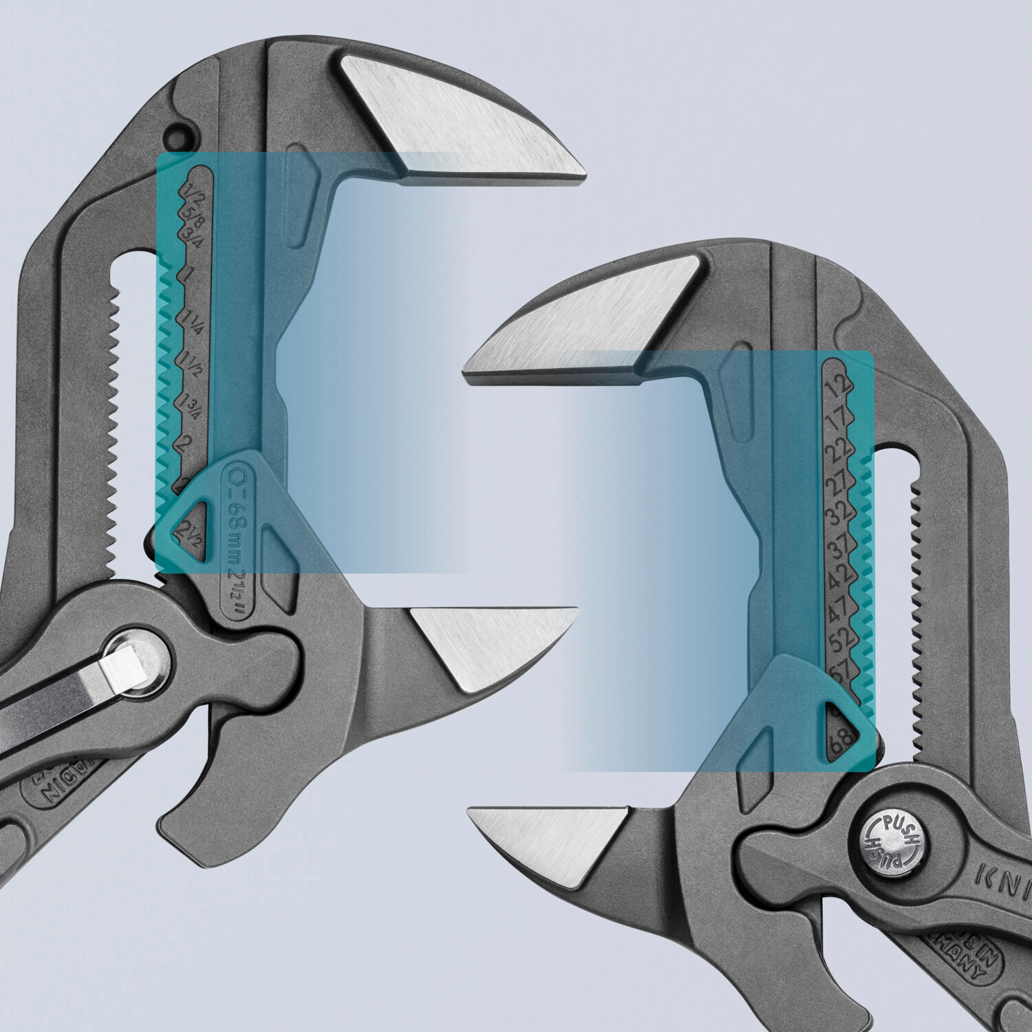 Pliers Wrench Replaces a full set of inch and metric open end wrenches up to 2 1/2" (68 mm). Smooth jaws for damage free installation of plated fittings - working directly on chrome. Adjustable tightening tool. Excellent for gripping, holding, pressing and bending applications. Zero backlash jaw surface pressure prevents damage to edges of sensitive components. 24 adjustment positions at the touch of a button directly on the workpiece. Laser-etched scale allows the wrench opening to be set before gripping onto workpiece - metric and inch markings. Parallel jaws allow infinitely variable gripping of all widths to the specified maximum size. Reliable catching of the hinge bolt: no unintentional shifting. The action of the jaws allows bolted connections to be tightened and released quickly using the ratchet principle. Lever transmission greater than 10-1 for strong gripping power. Chrome vanadium electric steel; forged, oil-hardened.