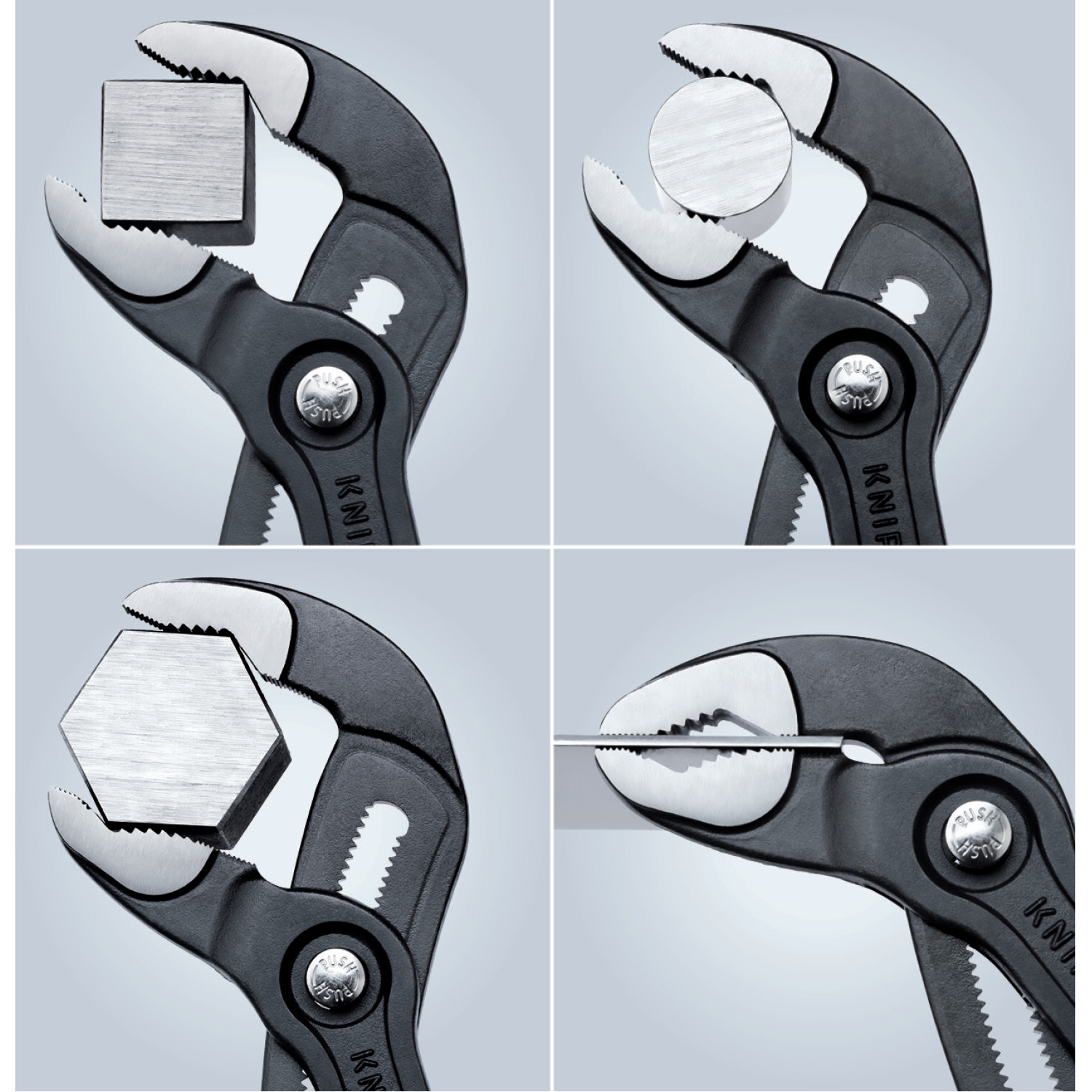 Cobra Water Pump Pliers Adjustment at the touch of a button directly on the workpiece. Fine adjustment for optimum adaptation to different size workpieces and a comfortable gripping position. Self-locking on pipes and nuts: no slipping off the workpiece and low handforce required. Gripping surfaces with special hardened teeth, teeth hardness (approx. 61 HRC): low wear and reliable gripping. Box-joint design: high stability because of double guide. Reliable catching of the hinge bolt: no unintentional shifting. Pinch guard prevents operators' fingers being pinched. 13 adjustment positions. Chrome vanadium electric steel; forged, multi-stage oil-hardened.The KNIPEX Cobra Pliers combines push-button adjustment and self-locking, non-slip jaws for a powerful high-tech water pump pliers.