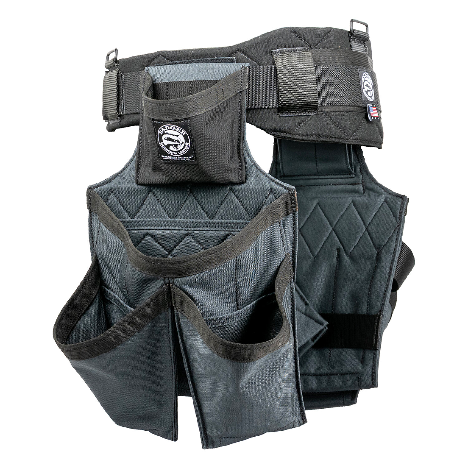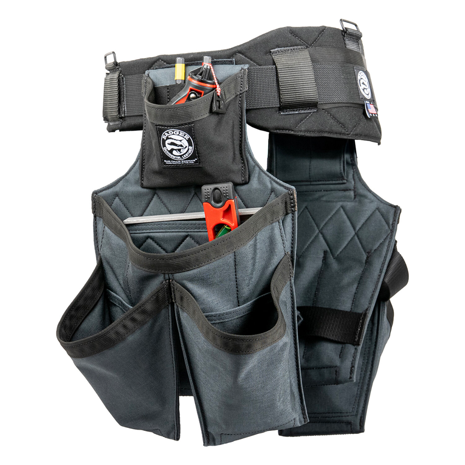 Our largest capacity pouches, with side-by-side lower pouches on the fastener side and a single lower pouch on the tool side.