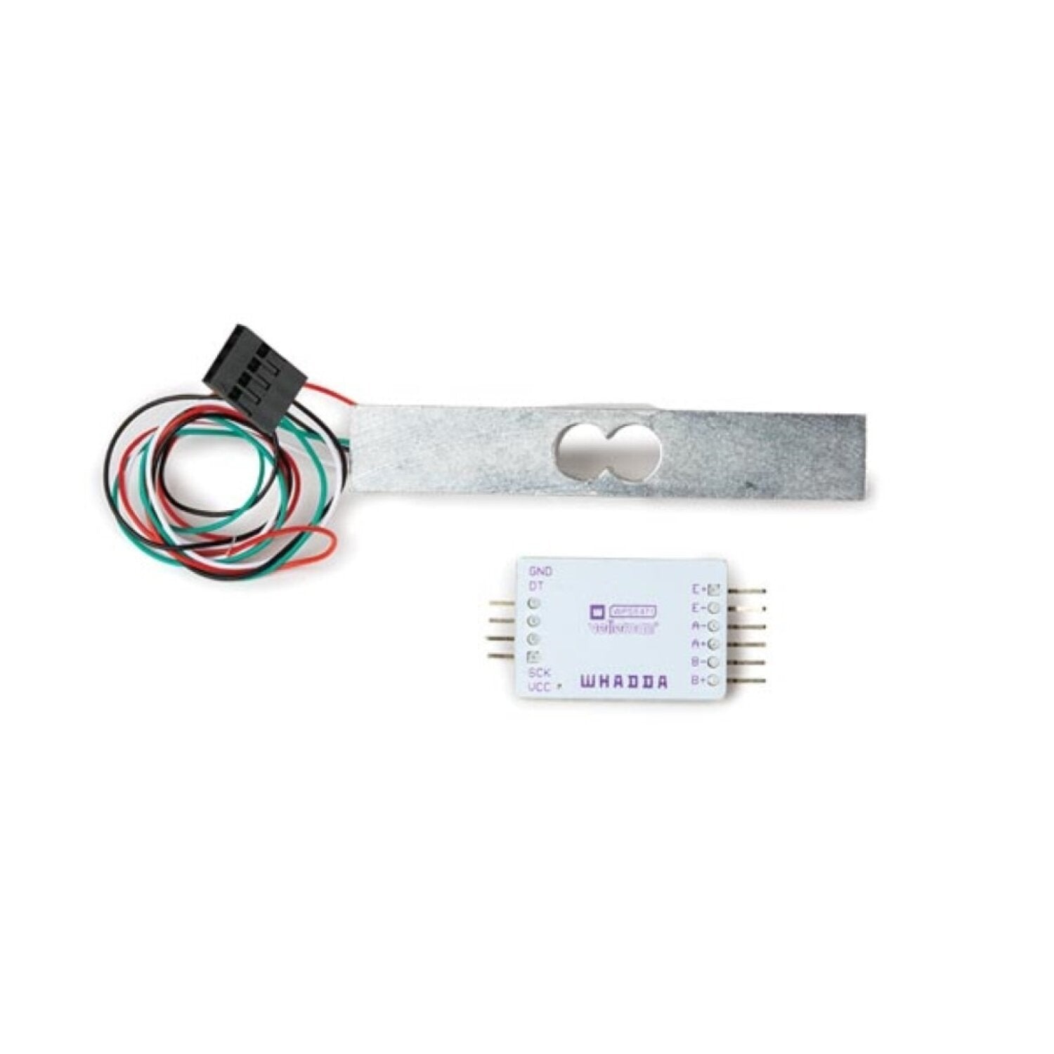 This module combines a precise load cell (max. 20 kg rated load) with a confidential A/D converter that can be easily connected to a microcontroller (e.g., an Arduino®-compatible board). For accurate measurement results, the fixed side of the load cell must be securely mounted to a stable surface. Connect a stable measuring surface to the measuring side of the load cell where the weights can be placed.