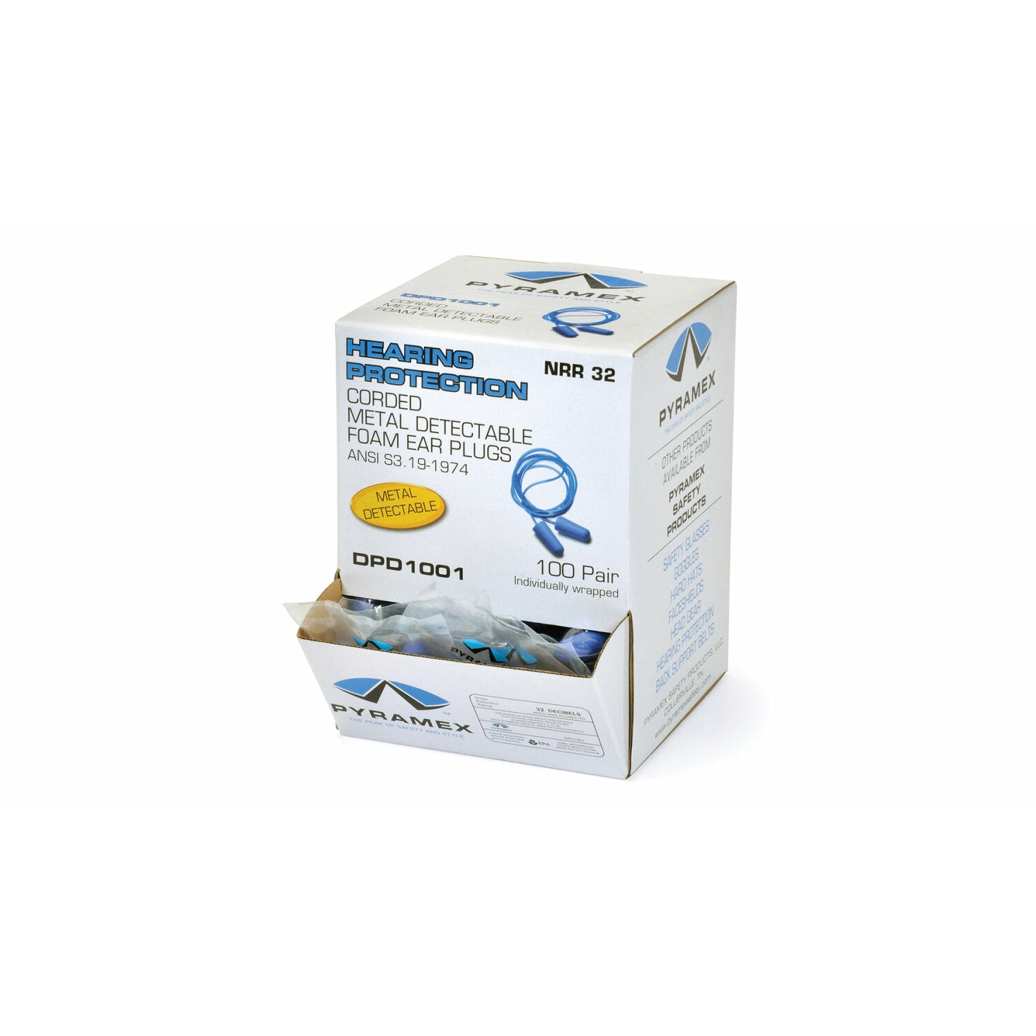Pyramex - Earplugs - Corded metal detectable disposable earplugs - 100 pair/box - Disposable corded ear plugs are embedded with an iron ball for metal and magnetic detectability. Plug gently expands and self adjusts to all size ear canals. NRR 30 dB/SNR 37dB