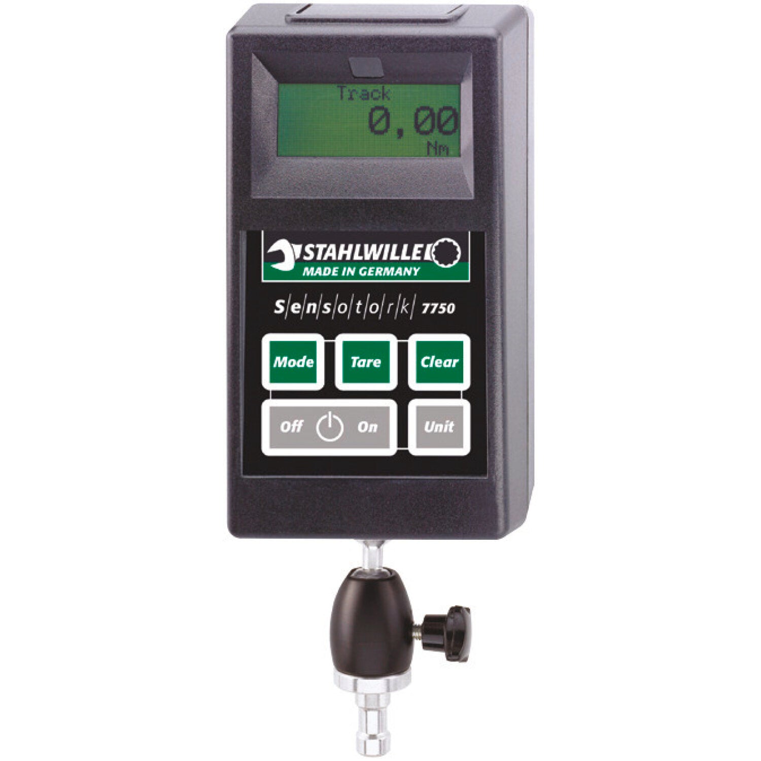 Display Unit for Torque Measurement – Designed for precise torque monitoring, this display unit supports measurement units in N·m, ft·lb, and in·lb. It features multiple operating modes including Track, Peak Hold, and First Peak (for hand tightening only). The integrated backlighting ensures clear readability, while both first-peak and peak torque values can be displayed when used with clicking torque wrenches. Mounted on a ball joint, the unit can be swivelled to any position for optimal viewing.