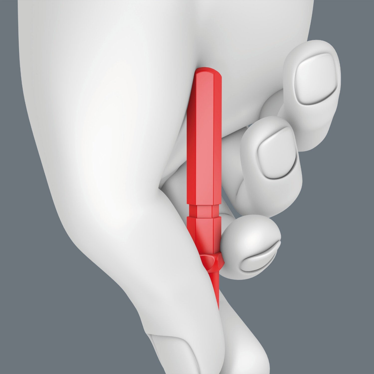 Durable foam insert; two-coloured for quick identification of missing parts; suitable for the Tool Rebel roller cabinet. Equipped with one 837 i RA bitholding screwdriver for Wera Kraftform Kompakt VDE interchangeable blades; with fine-toothed ratchet integrated in the handle (40 teeth/return angle 9°), one Kraftform 817 VDE bitholding screwdriver for Wera Kraftform Kompakt VDE interchangeable blades, 26 Wera Kraftform Kompakt VDE interchangeable blades with "Take it easy" Tool finder: Colour coding by profile and laser-engraved size indication.